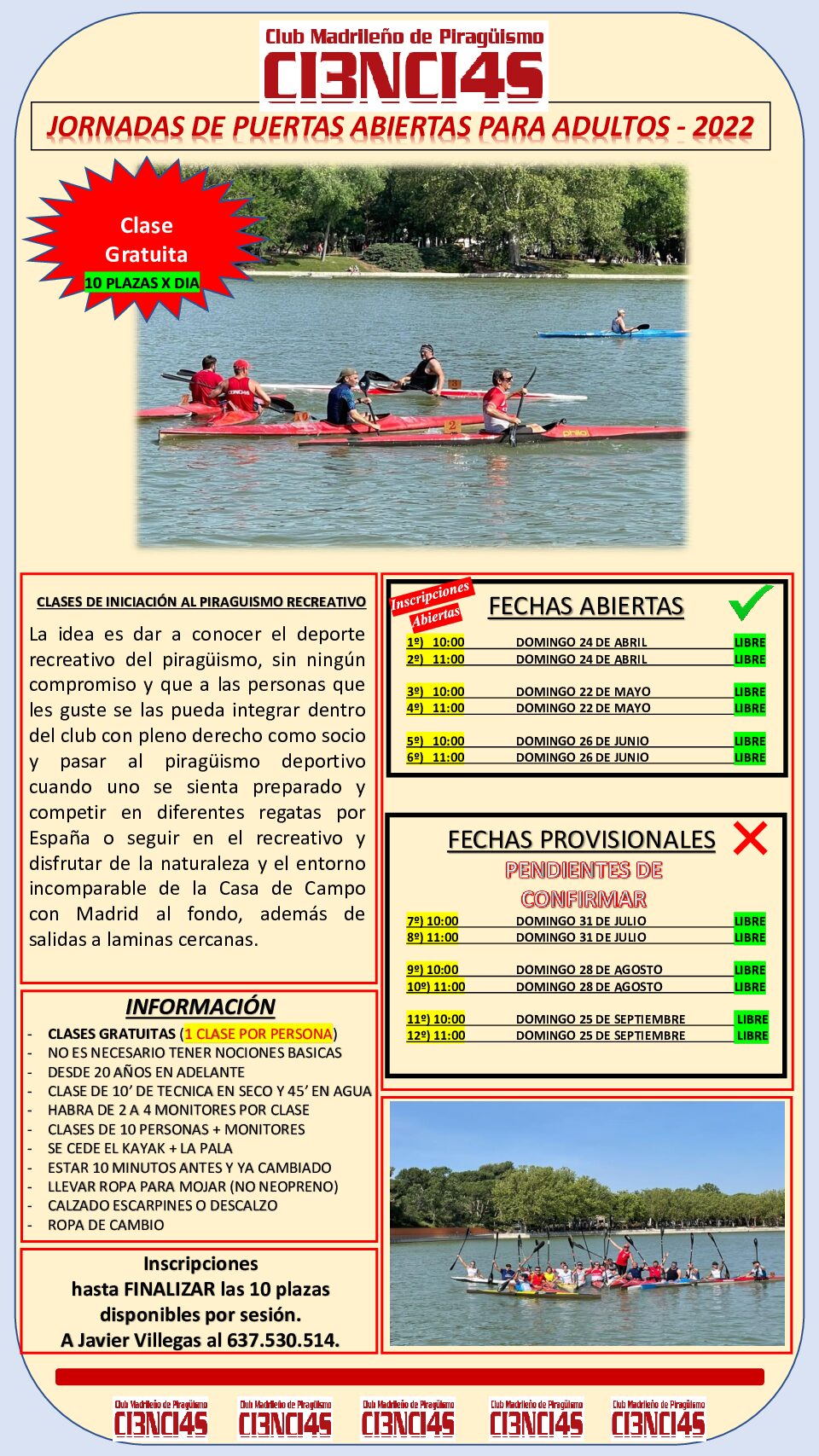 Los domingos 24 de Abril, 22 de Mayo y 26 de Junio en doble turno, de 10 a 11 y de 11 a 12, se pondrán en marcha las jornadas de PUERTAS ABIERTAS del club. Estas sesiones serán gratuitas y destinadas a adultos (+20 años). En cada sesión solo atenderemos a 10 alumnos. Proporcionarán el conocimiento de la práctica básica del piragüismo y abrirá a los iniciados el acceso como socio o socia del club para disfrutar de nuestro deporte temporada tras temporada. En función del balance de las tres primeras citas se abrirán nuevas fechas en verano. Una vez inscrito (Javier Villegas 637 530 514) te deberás presentar con ropa deportiva y calzado ligero, tipo escarpín, ropa de cambio (puede haber algún vuelco) y ganas de divertirte. No te lo pienses inscríbete ya que las plazas vuelan ¡¡¡¡