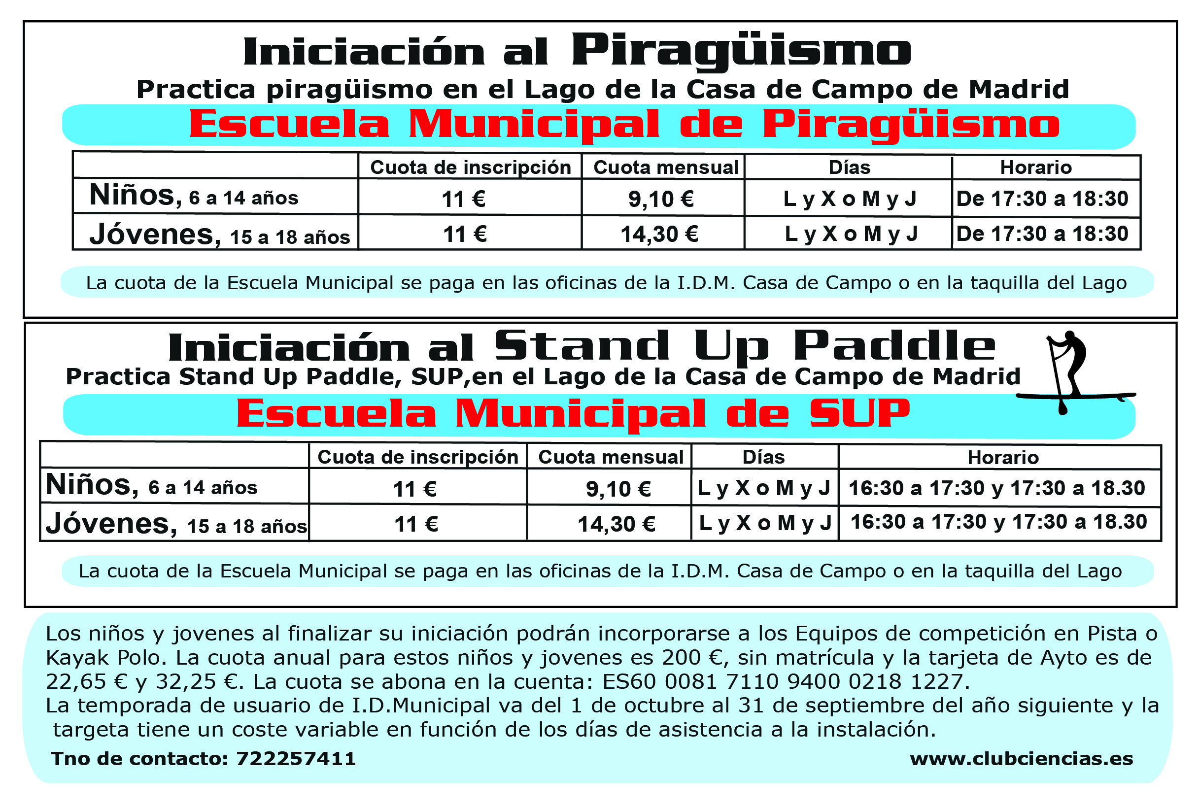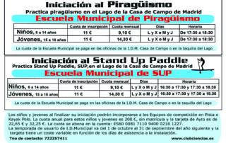 Esta semana, primera de octubre, comienza el curso de las Escuelas Municipales de Piragüismo y Stand Up Paddel, SUP. Estas escuelas admiten matriculas de niños y jóvenes para los turnos de 16:30 a 17:30 y de 17:30 a 18:30 tanto en los módulos de lunes y miércoles como en los de martes y jueves. Los precios son muy asequibles, matricula de 11 € y mensualidad de 9,10 € para niños (hasta 14 años) y 14,30 € para jóvenes (hasta 18). Tanto las matriculas como información mas detallada esta a disposición de los interesados en las taquillas del Lago de la Casa de Campo o en su orilla donde trabajan nuestros monitores. Al finalizar el aprendizaje en las Escuelas Municipales que se desarrollan en colaboración con el club los alumnos pueden pasar a engrosar los equipos del club en sus diferentes modalidades y descubrir el apasionante mundo del entrenamiento y la competición. Ya tenemos todo preparado para el deporte mas seguro, individual y con gran distancia entre practicantes, y el mas divertido.