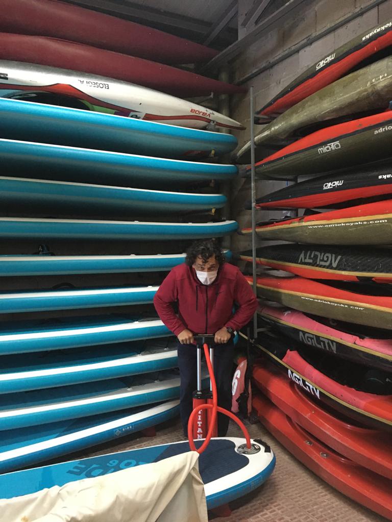 El lunes volvimos al Lago de la Casa de Campo que no surcábamos desde el comienzo del confinamiento, el 12 de marzo. Los protocolos que organizan el flujo en embarque y desembarque, la presencia de la mascarilla en tierra, el orden en la entrada a las naves y la fumigación con los "botijos a presión" con desinfectante se convirtieron en normales a los pocos minutos. La incomodidad de no tener vestuarios ni baños se ha solucionado rápidamente. Todos venimos cambiados, meados y c..., de casa y la vuelta se hace con mas ganas para ducharse. Los pisteros arrancan haciendo kilometros despacio, los turistas picandose en cada boya y los kayak-poleros, siguiendo fieles a la pesadilla que les acompaña, poniendo a punto campos y porterías. También la escuela comenzó con el aforo un poco reducido, grupos de seis y el sur-yoga arrancara en breve. La rareza la aportaron los kayak-poleros que estrenaban su pantalla de protección facial unida a la rejilla del casco. Esta medida nos impedirá disfrutar de la belleza de