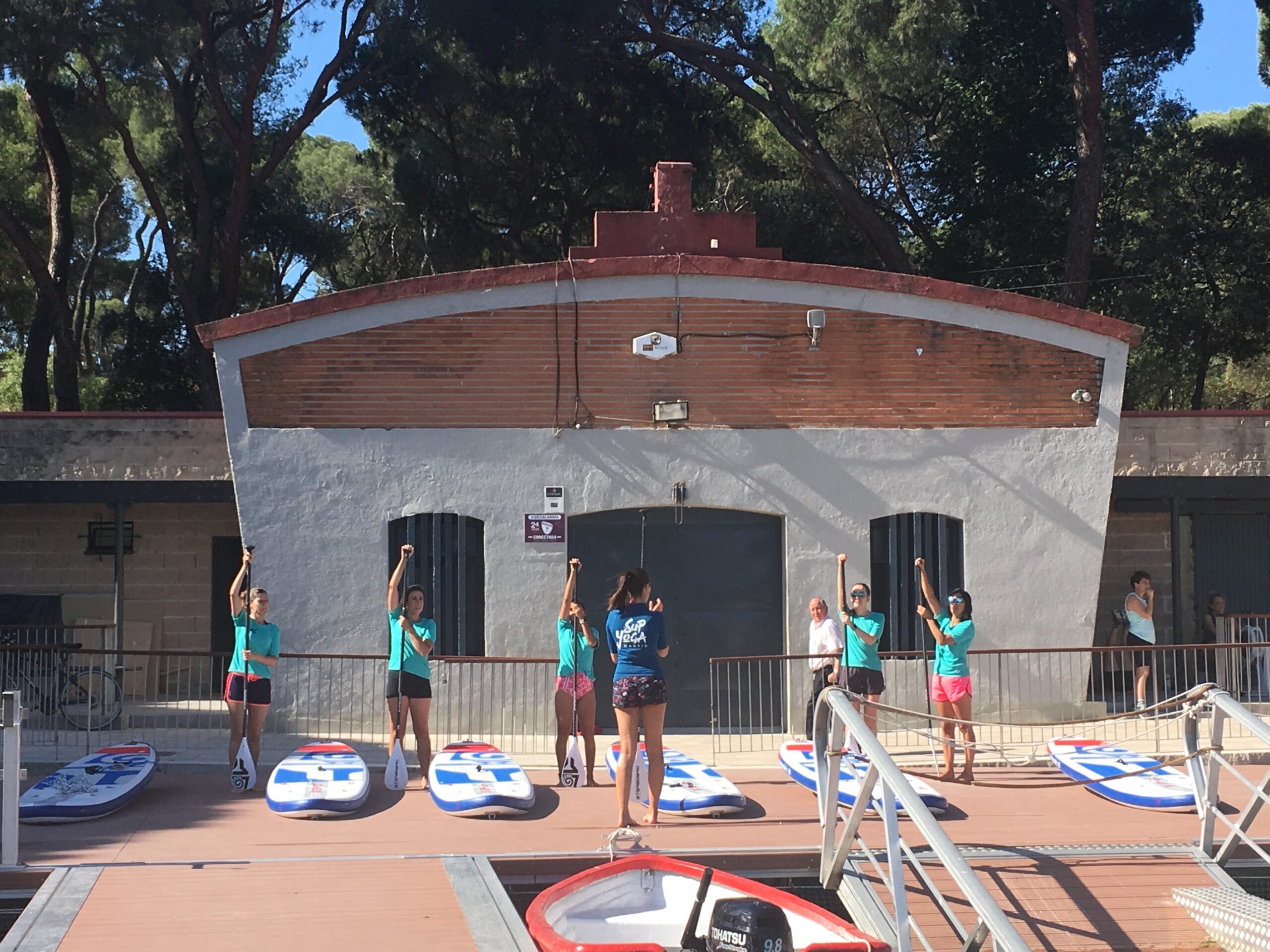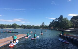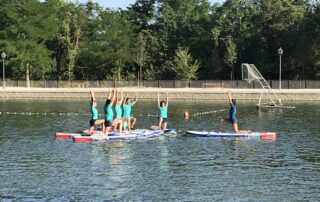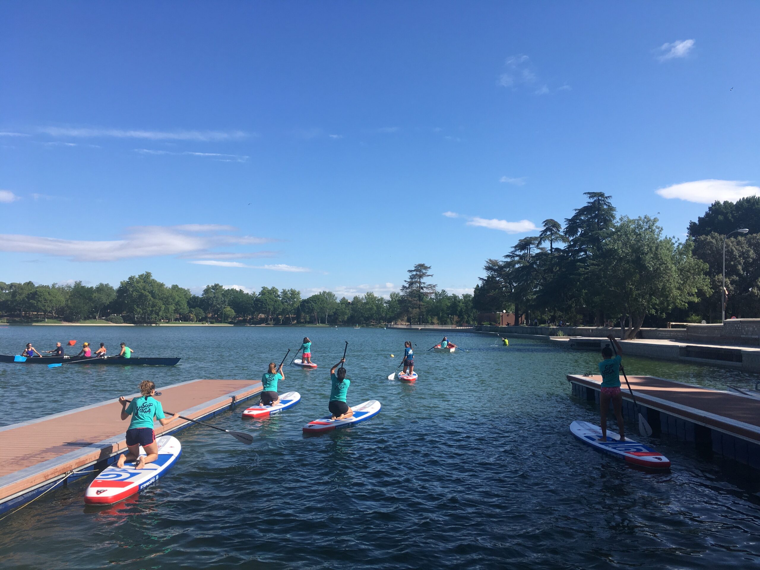 Este verano, desde Julio, se están desarrollando una nueva actividades en el Lago de la Casa de Campo. Es el SUP Yoga. El Stand Up Paddle, paleo de canoa de pie sobre tabla de surf, mezclado con el yoga. La exigencia de la inestabilidad que aporta la tabla sobre el agua como soporte de los ejercicios de yoga adaptados por Cristina. Cristina de Andrés, técnica de largo recorrido en la preparación y recuperación física de deportistas incorpora esta actividad en la que es pionera a las que ya desarrollamos en el Club. Actividad muy complementaria con el entrenamiento habitual en el espacio de La Raqueta compartido con los equipos de Kayak Polo Esta actividad complementa la recién creada sección de SUP para todos aquellos socios que deseen practicar, la Escuela Municipal que comenzará en Septiembre para niños y jóvenes que funcionará como la tradicional de piragüismo con precios muy asequibles y los cursos de SUP para adultos en el formato de cuatro sesiones, similares a los que se vienen impartiendo de