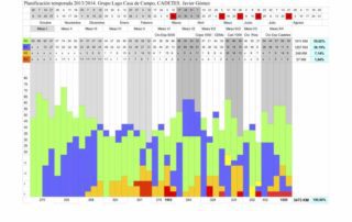 Recuperando documentos de la temporada anterior encontramos la planificación del trabajo de los cadetes en el agua. Casi 3500 Km programados con un porcentaje muy alto de kilómetros realizados. Si esto cayó el año pasado este año este año el menú será parecido. El Lago no será la mejor lámina de agua del mundo para el piragüismo pero pocos días impide finalizar el entrenamiento.